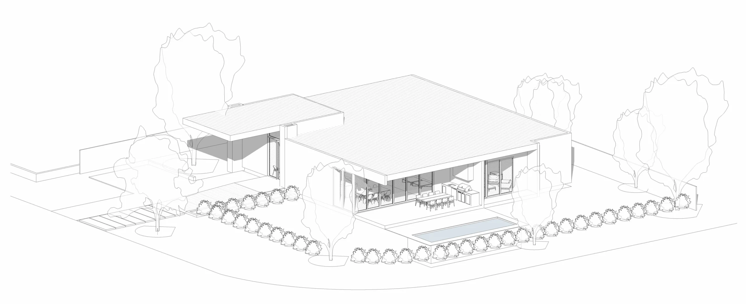 La vivienda se desarrolla en una sola planta continua, eliminando transiciones físicas para priorizar la fluidez entre el interior y un jardín frondoso que actúa como extensión natural de la vida. A través de patios privados y zonas de sombra amable, la arquitectura permite habitar el clima de Florida desde la pausa y la serenidad.